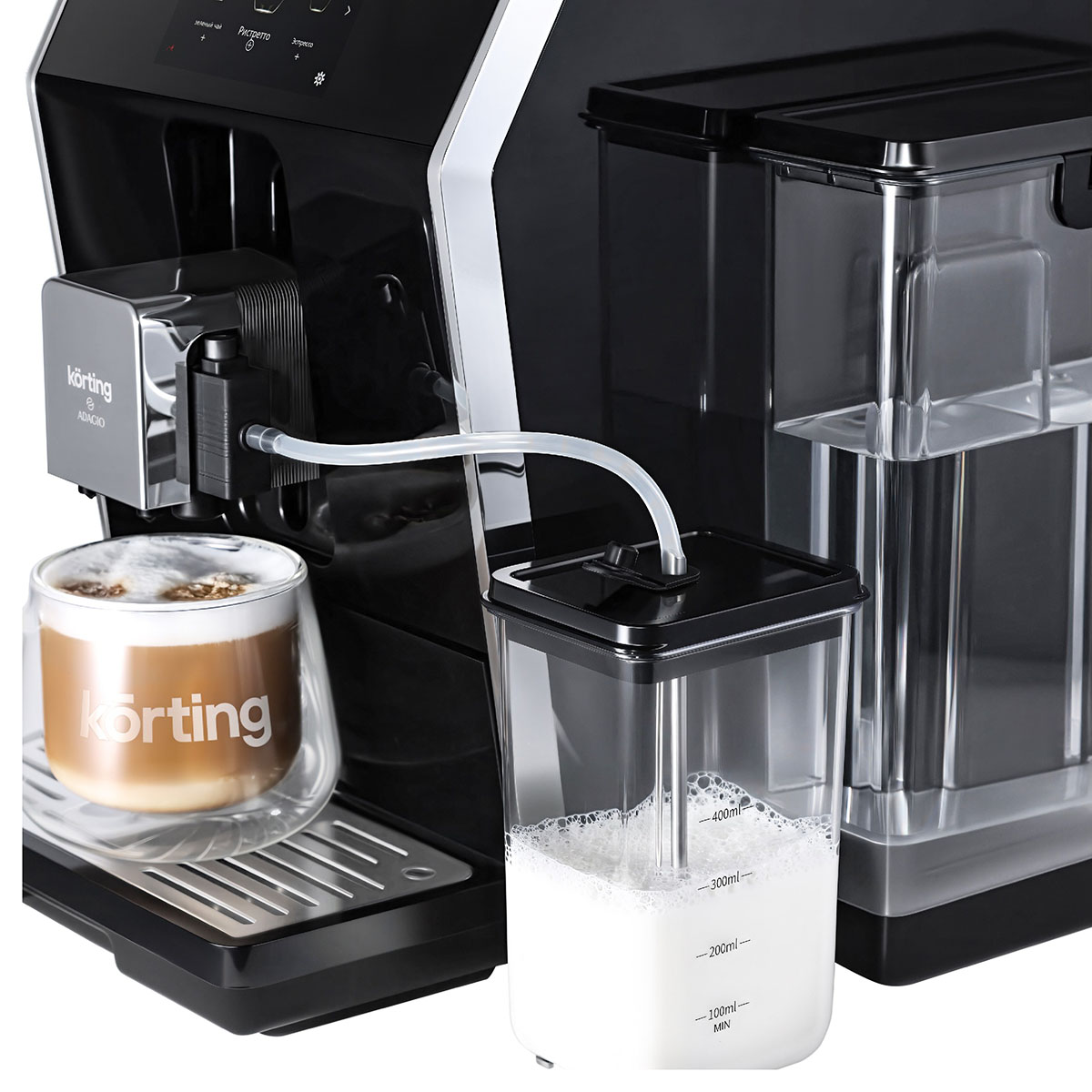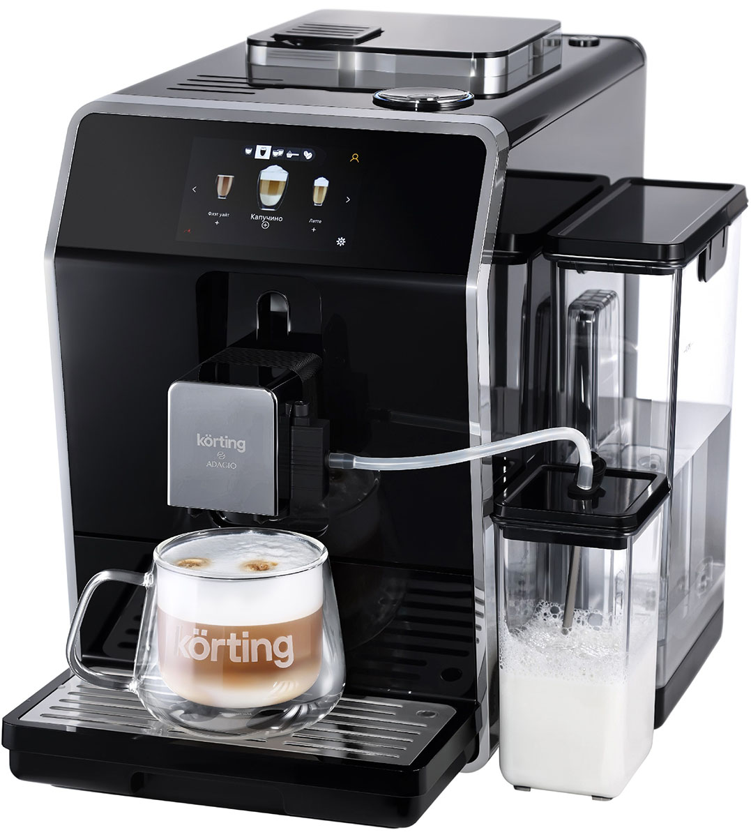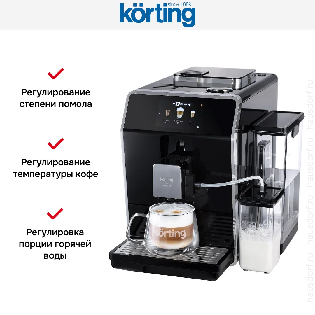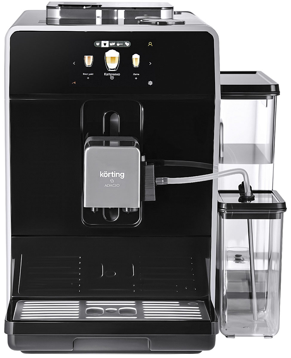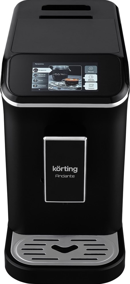 Кофемашина Korting KACM-2004 Adagio — автоматический прибор для дома и офиса, работающий как с зерновым, так и с молотым кофе. Она сочетает стильный черный корпус из нержавеющей стали и компактные габариты 36×31×44 см.