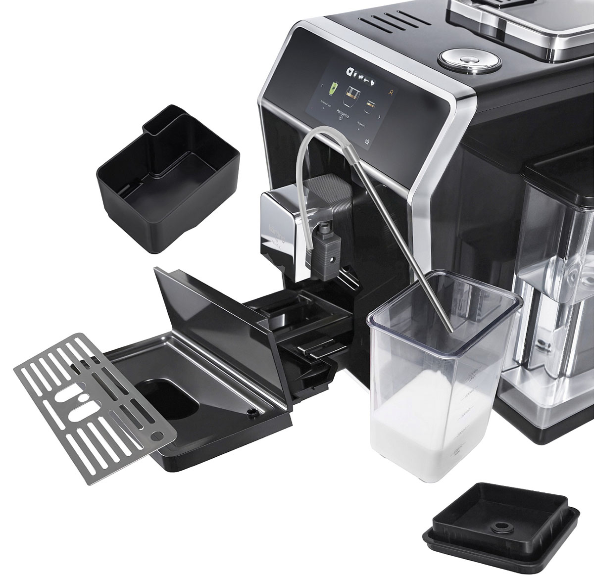 Панель управления оснащена дисплеем и сенсорными переключателями для интуитивной настройки. Память для пользовательских рецептов сохраняет любимые параметры, а установка жесткости воды и объем резервуара 1500 мл облегчают обслуживание и уменьшают частоту пополнений. Автоматическая очистка капучинатора поддерживает санитарную гигиену и продлевает срок службы молочной системы.