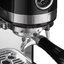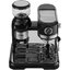 выглядит стильно и собранно: корпус сочетает строгие линии и контрастные поверхности, подчеркнутые элементами из нержавеющей стали. Аппарат черного цвета с блестящими металлическими вставками, компактно размещается при высоте 40 см, ширине 31 см и глубине 32 см. На передней панели расположен информативный дисплей и набор кнопочных и поворотных переключателей, которые легко читаются и управляются. Над рабочей зоной предусмотрена площадка для подогрева чашек, а поручни и носики сопроводительных узлов аккуратно вписаны в общую композицию.