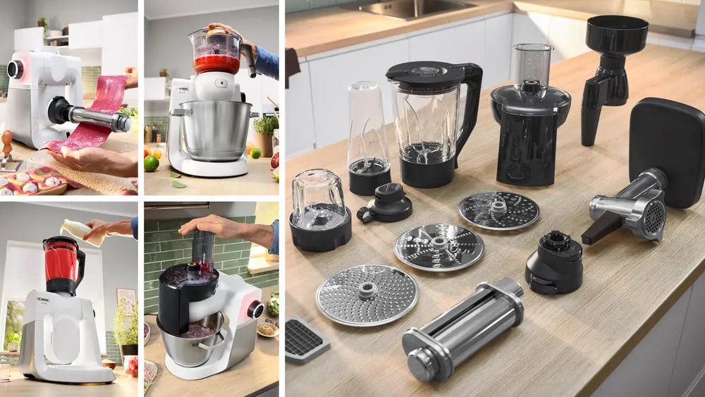 Современные кухонные комбайны — мощные многофункциональные устройства, способные заменить мясорубку, овощерезку, миксер, блендер и другие кухонные приборы. Для этого они в зависимости от модели комплектуются большим набором аксессуаров для измельчения, взбивания, нарезки, смешивания.