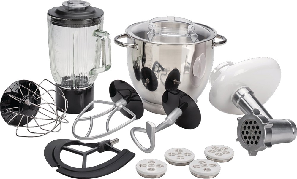 Благодаря продуманной системе насадок — включая крюки для теста, венчики для взбивания и универсальный нож — прибор легко справляется с широким спектром задач: от деликатного перемешивания и взбивания до интенсивного измельчения и нарезки. Все компоненты надёжно фиксируются, а система блокировки исключает запуск двигателя при неправильной сборке, обеспечивая безопасную эксплуатацию.