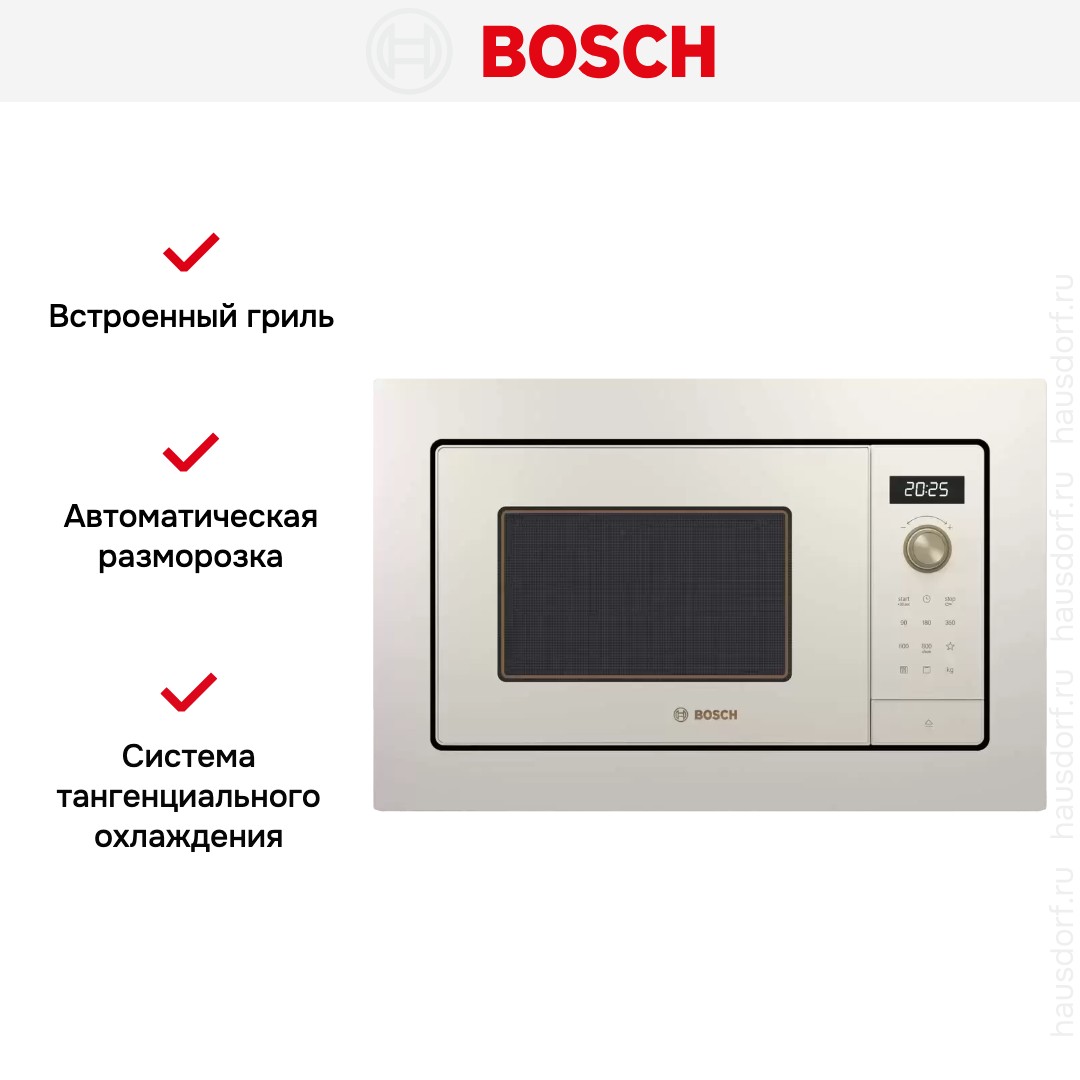 Светодиодное освещение рабочей камеры в микроволновых печах Bosch включается автоматически при открывании дверцы, позволяет контролировать готовность блюда или качество разморозки. LED-освещение отличается яркостью, устойчивостью к СВЧ-излучению, долговечностью и экономичностью.