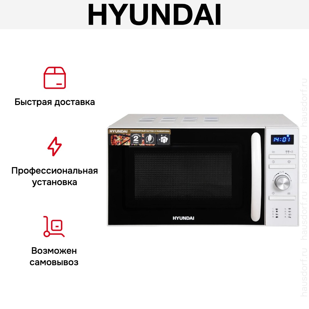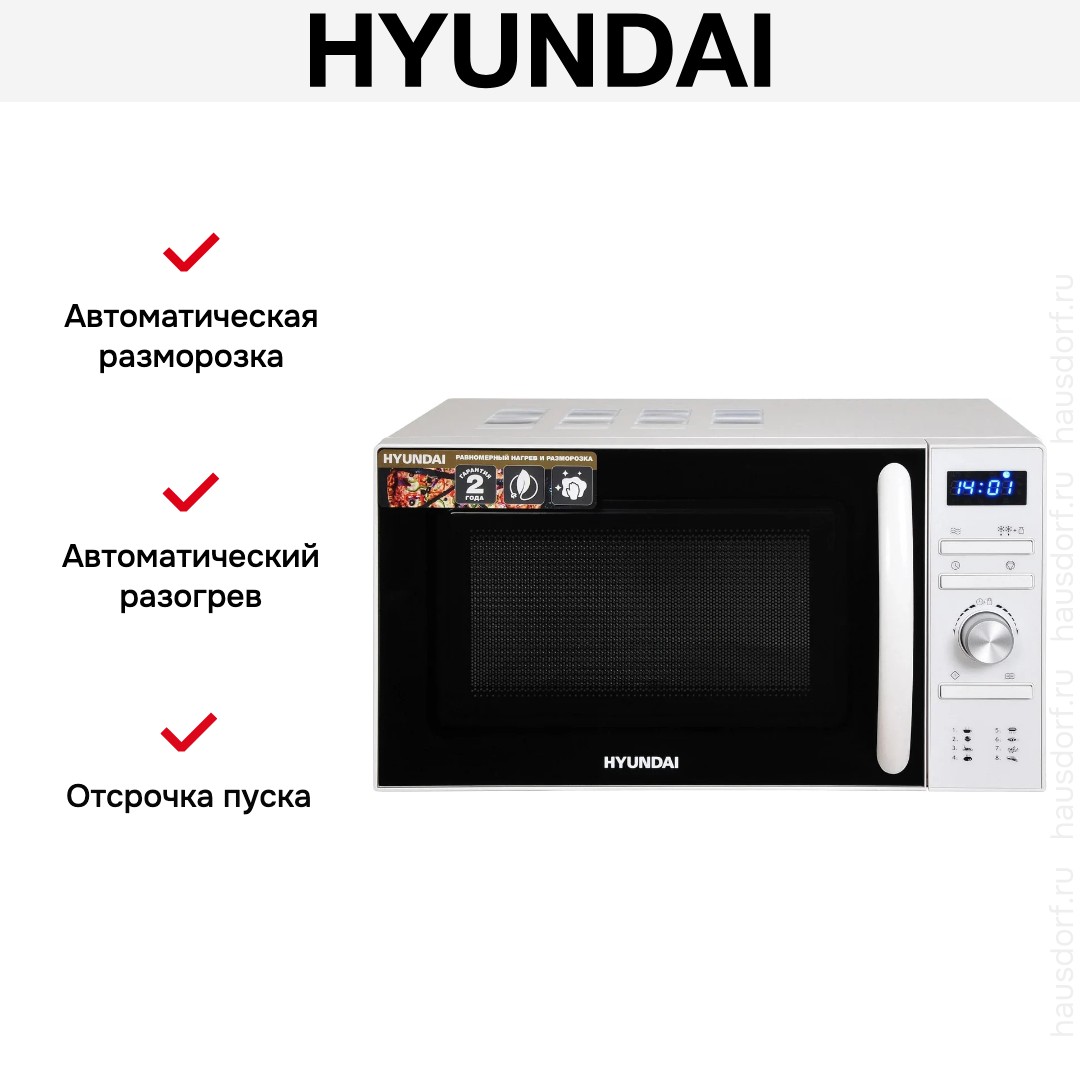Количество режимов в данной модели Хендай: 3 шт. Для обработки продуктов и готовых блюд используются следующие виды нагрева: Микроволны, Автоматический режим разморозки, Автоматический режим приготовления. Если вы спешите, а еду нужно разогреть, используйте быстрый старт — благодаря ему 30 секунд прибор работает на полной мощности. Отдельная опция для размораживания продуктов и полуфабрикатов облегчает жизнь — не нужно самостоятельно настраивать параметры. Автоматические программы для приготовления добавлены производителем также для упрощения работы.
