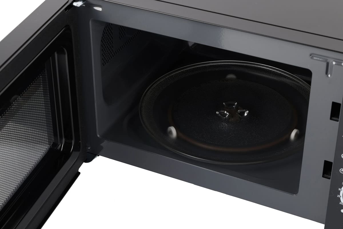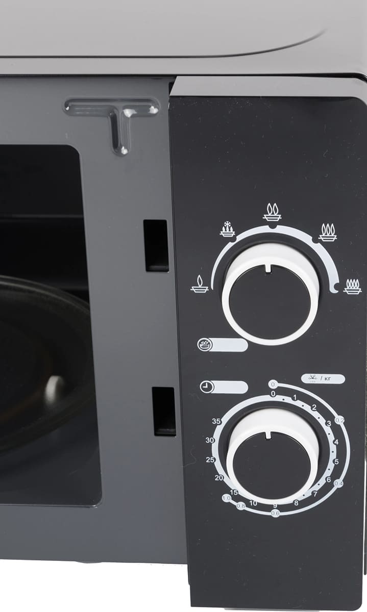 Материал внутренней поверхности — эмаль легкой очистки. Полезный объем для готовки — 20 л. Для установки и прогрева посуды используется классическое вращающееся блюдо. Стандартное механическое управление не вызовет трудностей ни у кого из вашей семьи. Для изменения настроек или выбора программ используются следующие переключатели: поворотные.