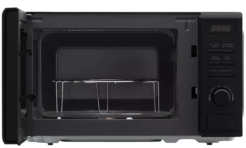 Конвекционный вентилятор устанавливается в микроволновках без поворотного стола: равномерное распределение горячего воздуха позволяет размещать в камере сразу несколько блюд. Комбинация вентилятора и верхнего гриля называется турбогрилем: этот режим очень хорош для выпечки больших пирогов и кексов. Сочетание гриля и конвекции подойдет и для приготовления больших кусков мяса или целой птицы и рыбы. Добавление традиционного нижнего нагревательного элемента превращает микроволновую печь в аналог полноценной духовки: с ее помощью можно готовить, разогревать и размораживать, запекать и томить, обжаривать и тушить.