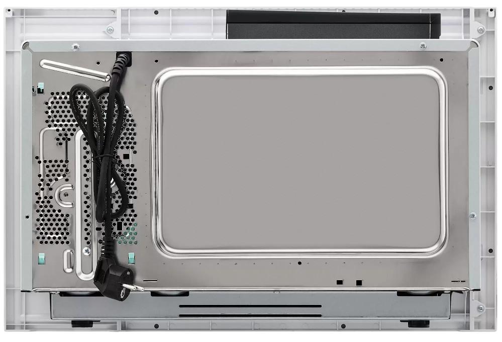 Внутри располагается камера объемом 25 литров с нержавеющей сталью, устойчивой к царапинам и высоким температурам. Такое покрытие выдерживает частую эксплуатацию и не впитывает запахи, поэтому уход за камерой занимает минимум времени. Для равномерного подрумянивания применён кварцевый нагреватель мощностью 1000 Вт, который быстро разогревается и обеспечивает хрустящую корочку на блюдах. Основной режим микроволн работает на 900 Вт и имеет пять уровней мощности, что даёт точный контроль для разморозки, разогрева и приготовления. Комбинация микроволн и гриля позволяет готовить якорные блюда быстрее и с красивой корочкой.