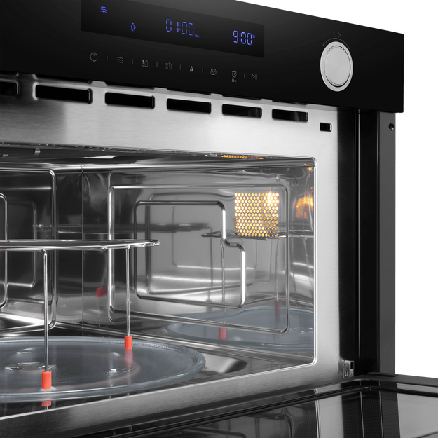 Конвекционный вентилятор устанавливается в микроволновках без поворотного стола: равномерное распределение горячего воздуха позволяет размещать в камере сразу несколько блюд. Комбинация вентилятора и верхнего гриля называется турбогрилем: этот режим очень хорош для выпечки больших пирогов и кексов. Сочетание гриля и конвекции подойдет и для приготовления больших кусков мяса или целой птицы и рыбы. Добавление традиционного нижнего нагревательного элемента превращает микроволновую печь в аналог полноценной духовки: с ее помощью можно готовить, разогревать и размораживать, запекать и томить, обжаривать и тушить.