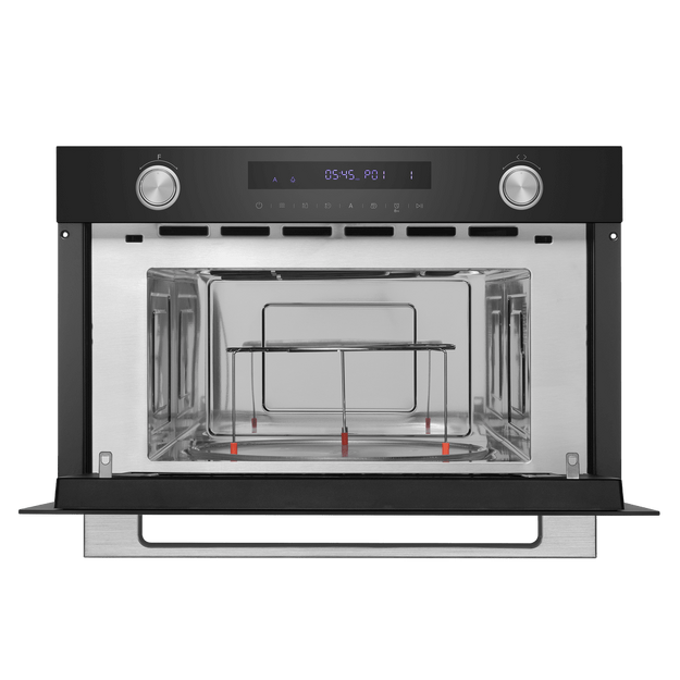 Глубина микроволновой печи —параметр, наиболее сильно влияющий на объем камеры и на диаметр вращающегося стеклянного блюда. Отдельно стоящие микроволновки соло, а также приборы, оснащенные грилем, имеют глубину от 35 до 45 см. При их установке на столешнице следует учитывать, в какую сторону и насколько широко будет открываться дверца. Глубина микроволновки, которая встраивается в кухонную мебель, также варьируется в широком диапазоне. Для полноразмерных моделей с откидной или навесной дверцей она может составить около 52-55 см, а для менее вместительных приборов — порядка 32-35 см.