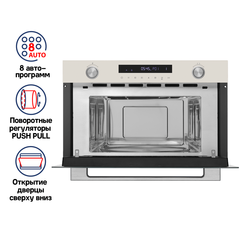 Глубина микроволновой печи —параметр, наиболее сильно влияющий на объем камеры и на диаметр вращающегося стеклянного блюда. Отдельно стоящие микроволновки соло, а также приборы, оснащенные грилем, имеют глубину от 35 до 45 см. При их установке на столешнице следует учитывать, в какую сторону и насколько широко будет открываться дверца. Глубина микроволновки, которая встраивается в кухонную мебель, также варьируется в широком диапазоне. Для полноразмерных моделей с откидной или навесной дверцей она может составить около 52-55 см, а для менее вместительных приборов — порядка 32-35 см.