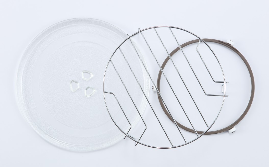 Вращающееся стеклянное блюдо в микроволновой печи позволяет микроволнам равномерно прогревать все блюдо. В большинстве печей магнетрон — источник электромагнитного излучения, — находится в нижней части корпуса или реже сбоку. Микроволны могут проникать в продукты как напрямую, так и отразившись от стенок и потолка камеры. Стеклянное блюдо, иногда называемое также поворотным столом или поддоном, устанавливается на вращающийся механизм с колесиками. Диаметр его зависит от объема камеры и может составить от 20 до 35 см. Размещать на нем можно как одну, так и несколько форм с готовящейся пищей.