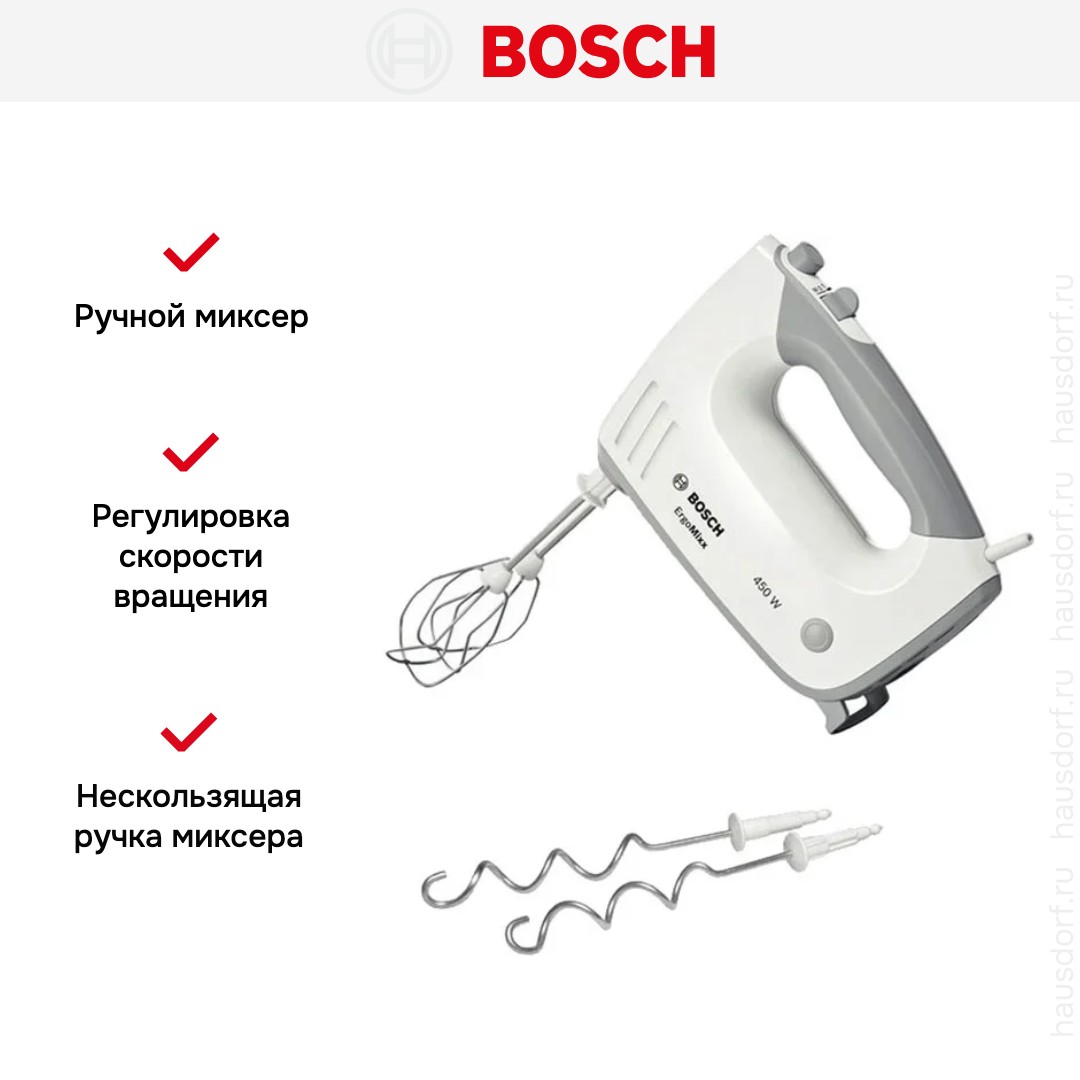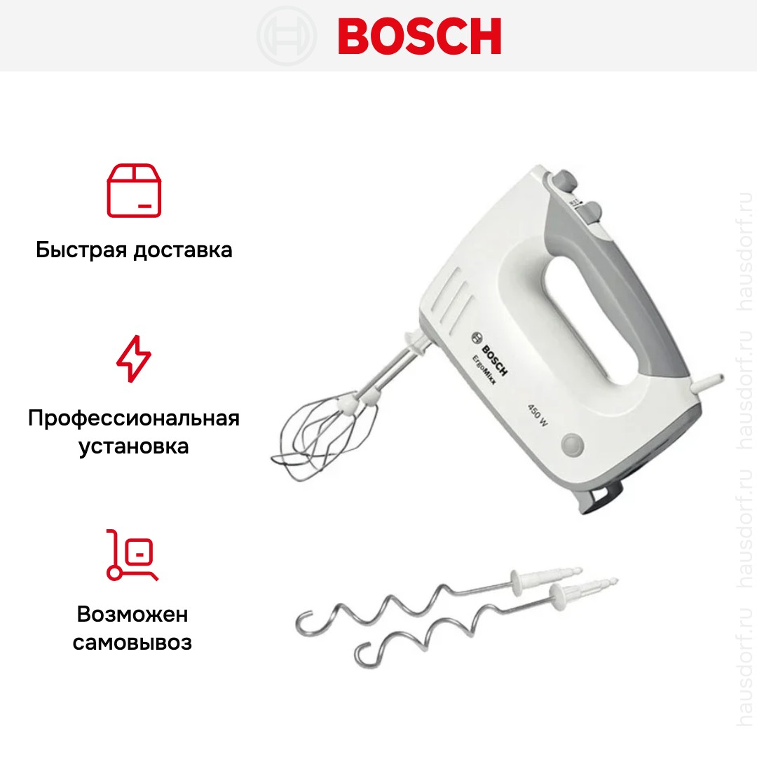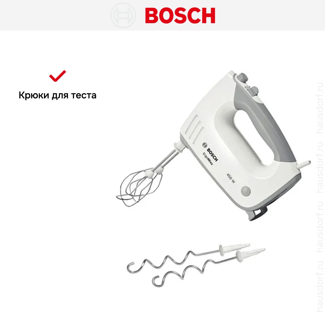 Обратите внимание на цвет миксера Бош — белый — он может стать как гармоничным дополнением кухонной обстановки, так и ярким акцентом. В комплекте с самим прибором идут дополнительные элементы: венчик для взбивания, крюки для теста.