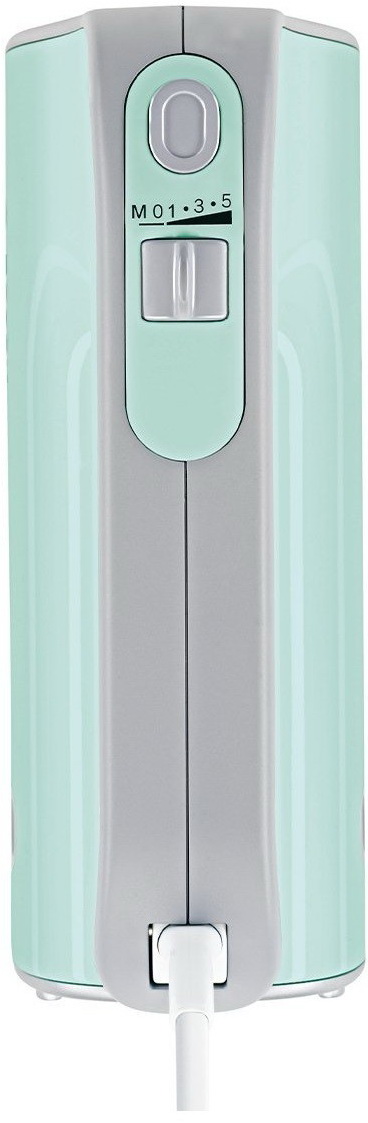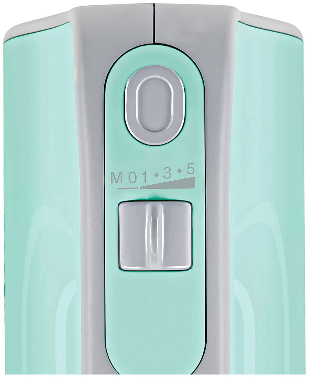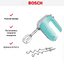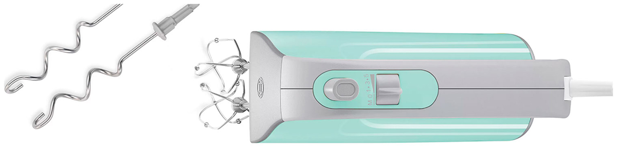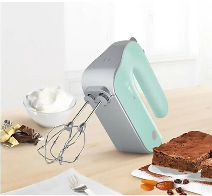 Обратите внимание на цвет миксера Бош — бирюзовый — он может стать как гармоничным дополнением кухонной обстановки, так и ярким акцентом. В комплекте с самим прибором идут дополнительные элементы: венчик для взбивания, крюки для теста.