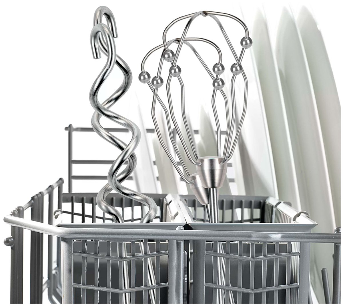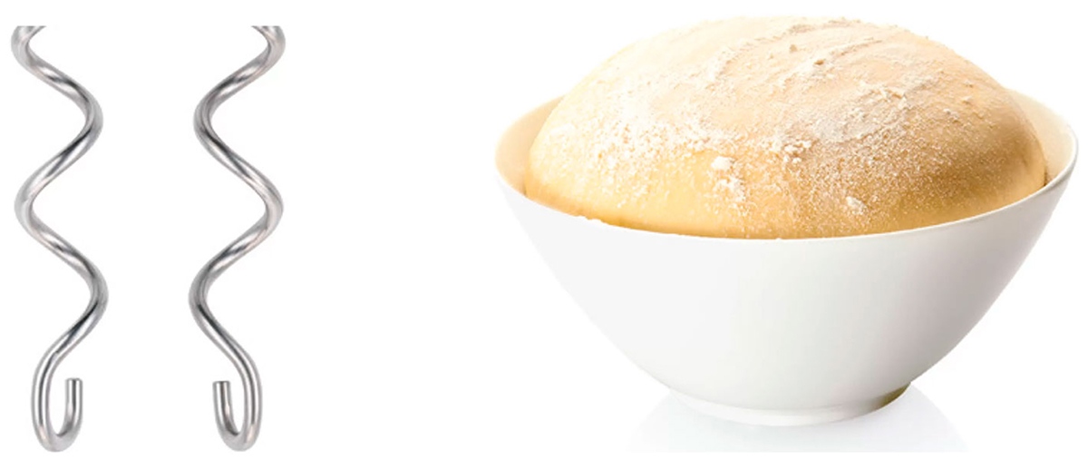 Крюки для теста представляют собой спираль, изготовленную из нержавеющей стали, с крюком на конце и используются для смешивания теста разной консистенции, от жидкого до плотного, а также для приготовления густых соусов или кремов. При использовании крюков получается однородная, но не взбитая смесь.