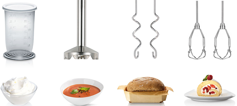Ручной миксер — компактное устройство невысокой мощности, предназначенное для смешивания жидких или сыпучих ингредиентов, для приготовления пюре и жидкого теста, для взбивания сливок или яичных белков. В пластиковый корпус с ручкой вставляются насадки — венчики для взбивания или крюки для теста.