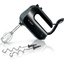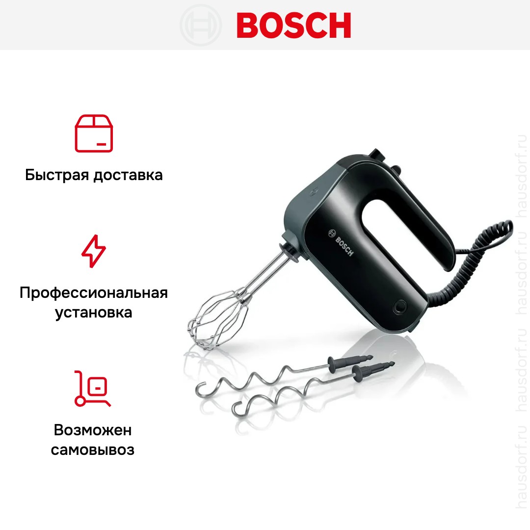 Обратите внимание на цвет миксера Бош — черный — он может стать как гармоничным дополнением кухонной обстановки, так и ярким акцентом. В комплекте с самим прибором идут дополнительные элементы: венчик для взбивания, крюки для теста.