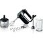 Обратите внимание на цвет миксера Бош — черный — он может стать как гармоничным дополнением кухонной обстановки, так и ярким акцентом. В комплекте с самим прибором идут дополнительные элементы: венчик для взбивания, измельчитель, крюки для теста, мерный стакан с крышкой, насадка-блендер.
