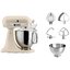 Обратите внимание на цвет миксера Китчен Эйд — лён — он может стать как гармоничным дополнением кухонной обстановки, так и ярким акцентом. В комплекте с самим прибором идут дополнительные элементы: венчик для взбивания, крюки для теста, насадка-лопатка для перемешивания, защитный обод, стальная чаша объемом 3 л, лопатка с гибким ребром.