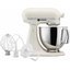 Чаша рассчитана на 4.8 л — этого хватает и для ежедневных порций, и для более объёмной партии теста или крема. В комплект входят три насадки: венчик для воздушных текстур, крюки для замеса, а также лопатка с гибким ребром, которая бережно собирает смесь со стенок.