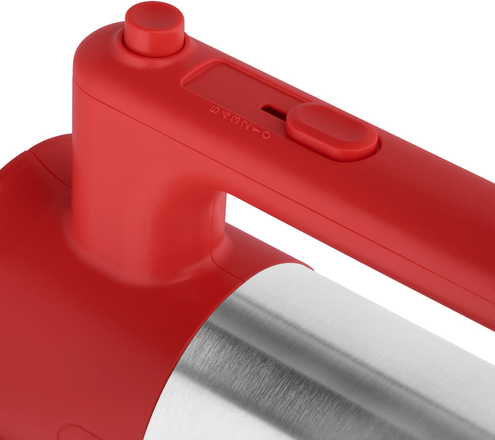 Выглядит ярко и заметно: корпус красного цвета привлекает внимание, а сочетание пластика и деталей из нержавеющей стали придаёт прибору аккуратный, но выразительный образ. Модель не оснащена чашей, поэтому её форма компактна и ориентирована на использование вручную. Габариты 15×19.1×8.9 см и масса 0,98 кг делают устройство лёгким в обращении и удобным для хранения на полке или в шкафчике.