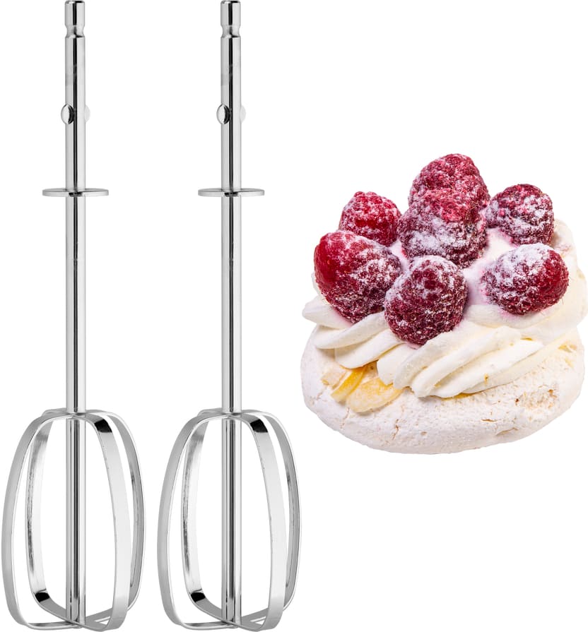 - Четыре насадки из нержавеющей стали, кнопка быстрого отсоединения и венчик с крюками в комплекте.