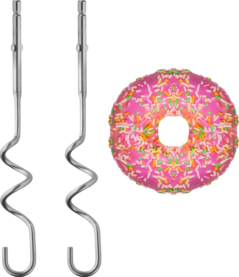 Крюки для теста представляют собой спираль, изготовленную из нержавеющей стали, с крюком на конце и используются для смешивания теста разной консистенции, от жидкого до плотного, а также для приготовления густых соусов или кремов. При использовании крюков получается однородная, но не взбитая смесь.