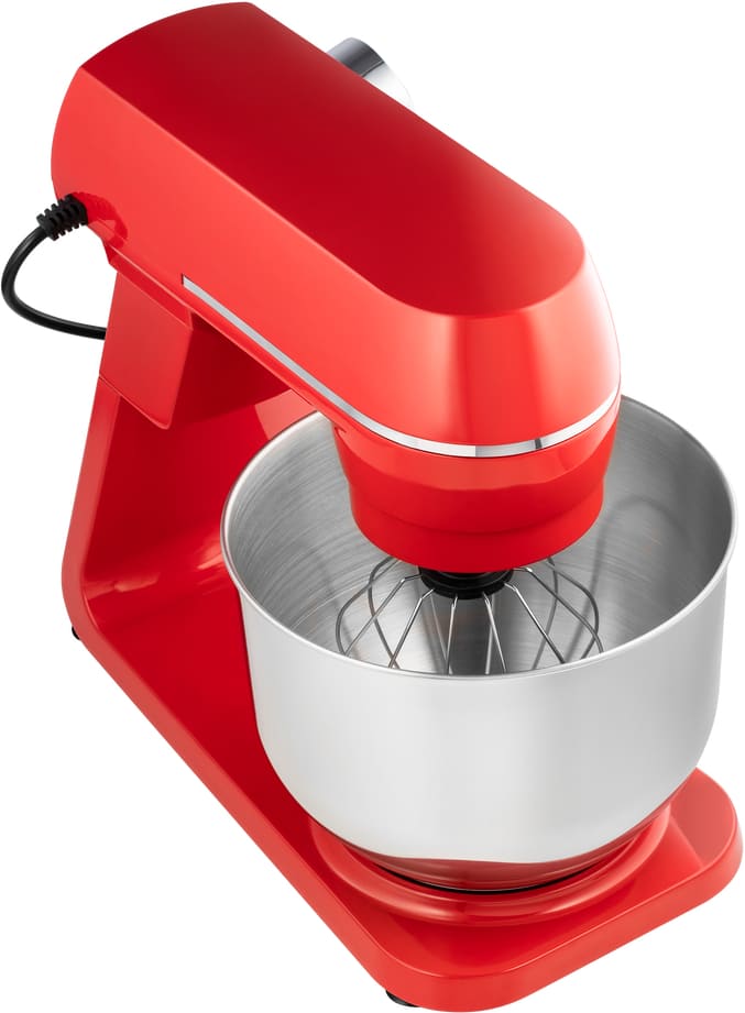 Обратите внимание на цвет миксера Маунфилд — красный — он может стать как гармоничным дополнением кухонной обстановки, так и ярким акцентом. В комплекте с самим прибором идут дополнительные элементы: венчик для взбивания, защитный обод с воронкой для засыпания продуктов, крюки для теста, насадка-лопатка для перемешивания.