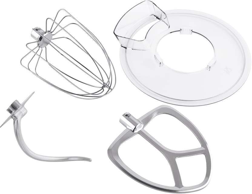 Обратите внимание на цвет миксера Маунфилд — красный — он может стать как гармоничным дополнением кухонной обстановки, так и ярким акцентом. В комплекте с самим прибором идут дополнительные элементы: венчик для взбивания, защитный обод с воронкой для засыпания продуктов, крюки для теста, насадка-лопатка для перемешивания.