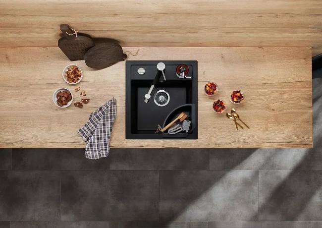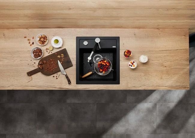 Материал Silgranit сочетает в себе прочность и приятную на ощупь текстуру натурального камня. Композит устойчива к царапинам, ударам и воздействию высоких температур, поэтому поверхность сохраняет эстетический вид при активной эксплуатации. Благодаря плотной структуре загрязнения не проникают глубоко, и уход сводится к протиранию мягкой губкой и нейтральному моющему средству. Черный тон устойчив к выцветанию, что важно для долговечности внешнего вида.