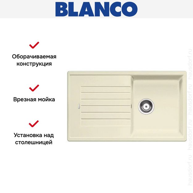 Blanco Zia 5 S — гранитная мойка оборачиваемой конструкции. Модель укомплектована отводной арматурой с корзинчатым вентилем, обеспечивающим защиту от образования засоров.