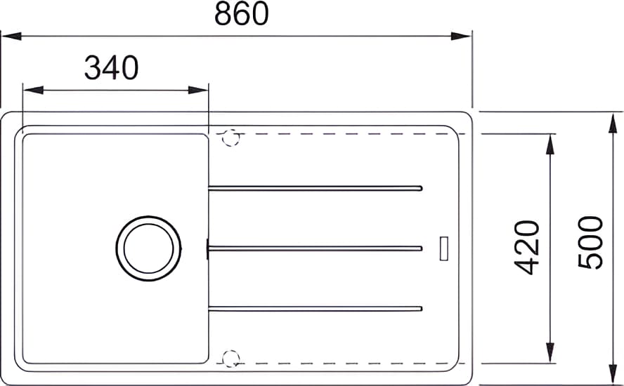 Основная чаша одна, её внутренние размеры 34×20 см при глубине 20 см. Такая глубина позволяет мыть крупную посуду и кастрюли, одновременно снижая разбрызгивание воды. Наличие перелива защищает от случайного переполнения, а диаметр сливного отверстия 3 1/2″ совместим со стандартной арматурой.