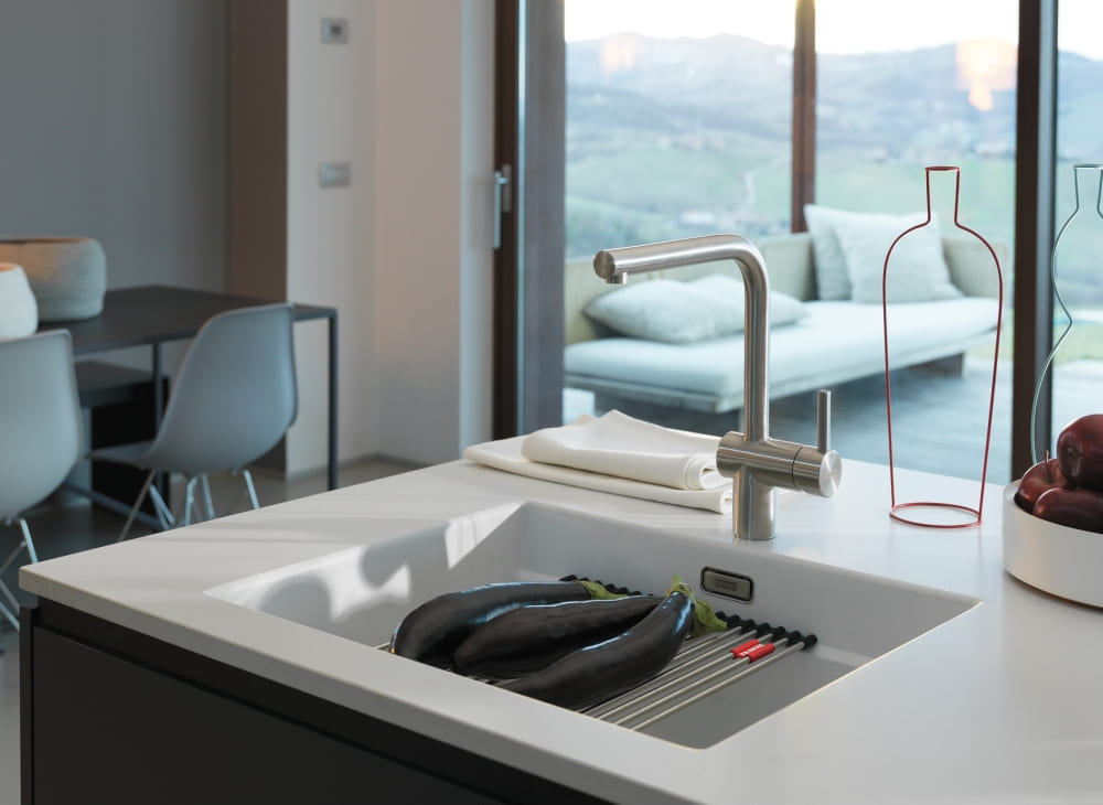 вровень со столешницей — создается ощущение бесшовного пространства, а если мойка сделана из того же материала, то и единого дизайна;