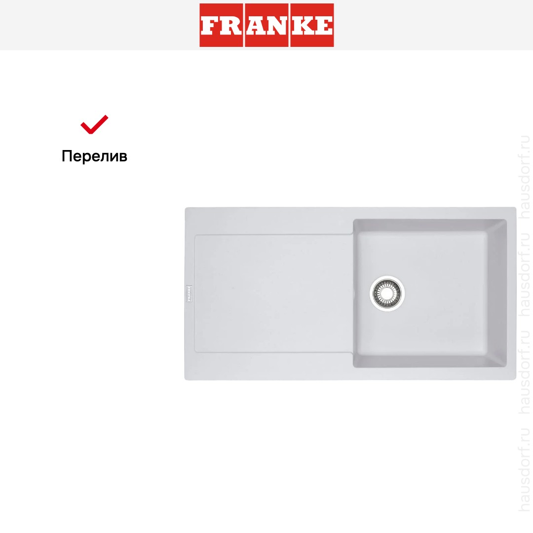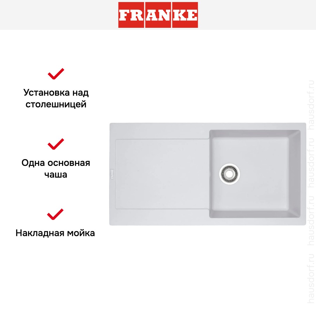Мойка Franke MRG 611 97 белый — накладная прямоугольная модель в стиле Maris с чистыми линиями и мягкой белой отделкой, которая органично впишется в любой кухонный интерьер. Ее спокойный дизайн делает акцент на функциональности, не перегружая пространство декоративными элементами. Матовый фрагранит придает поверхности благородный вид и исключает блики, сохраняя аккуратный внешний вид при длительной эксплуатации.