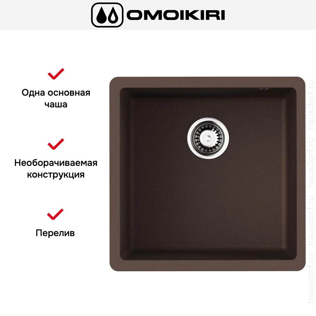 Мойка Omoikiri Bosen 44 U ES — врезная квадратная модель с компактными габаритами 44×44 см, разработанная для установки под столешницу. Она сочетает аккуратный минимализм и практичность, что делает её отличным выбором для компактных кухонь и встроенных рабочих зон. Эспрессо оттенок придает глубину интерьеру и хорошо сочетается как с тёмными, так и со светлыми поверхностями.