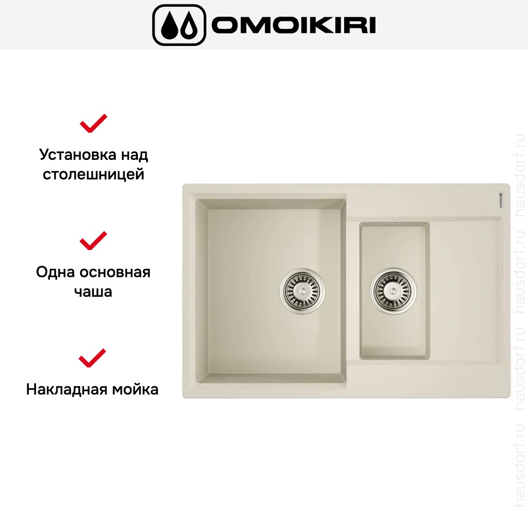 Накладная мойка Omoikiri — отличный выбор для тех, кто хочет создать гармоничное пространство с удобной сантехникой. простой в установке. Преимущество такой конструкции: легко подобрать практически к любой кухне и не придется демонтировать вместе с тумбой при ремонте или перестановке остальной мебели. Данная модель имеет стандартную форму, поэтому подходит большинству пользователей. Устанавливается над столешницей: это самый простой способ монтажа, зачастую с ним можно справиться даже без специалистов, главное — правильно рассчитать размеры ниши.