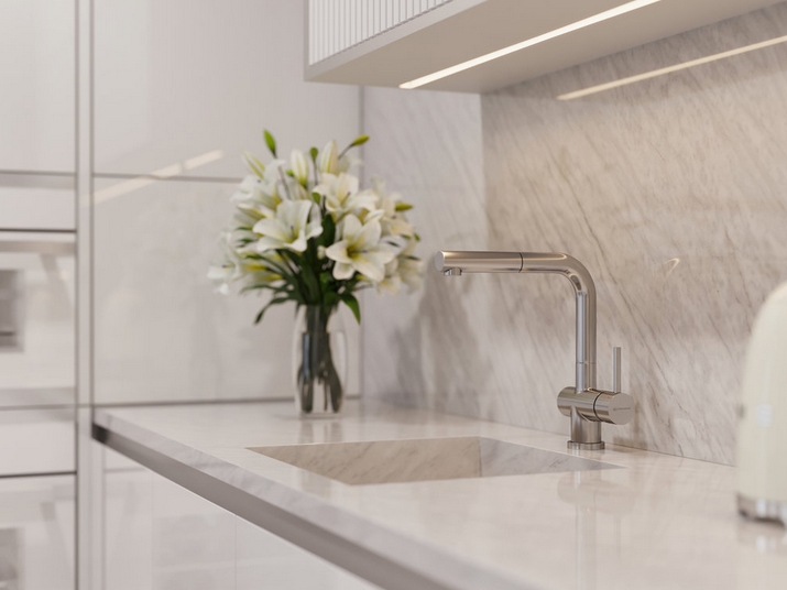 вровень со столешницей — создается ощущение бесшовного пространства, а если мойка сделана из того же материала, то и единого дизайна;