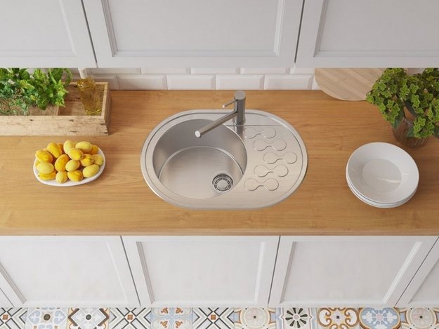 Круглые и овальные мойки смотрятся эффектно и стильно, у них отсутствуют углы, так что уход не составляет труда. При одинаковом объеме круглая мойка будет казаться меньше, чем квадратная. Такие модели часто используют в классическом интерьере. Установка такой мойки требует круглого отверстия в столешнице, что также достаточно просто сделать. Угловые мойки позволяют заполнить пространство в углах, экономя место в помещении. Раковины в них могут быть различной формы, а место за мойкой можно использовать для хранения. Мойки в форме трапеции выглядят свежо и оригинально, но подойдут не для всякого интерьера.
