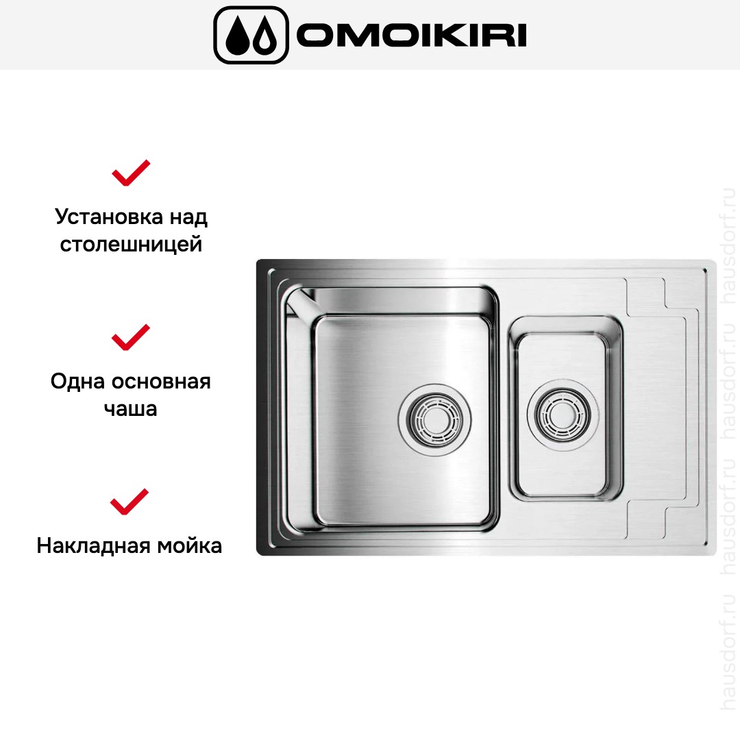 Мойка OMOIKIRI Mizu 78-2 — накладная прямоугольная модель размером 78×48 см в аккуратном стальном исполнении, которая органично впишется в современную кухню. Ее чистые геометрические линии и матовая поверхность создают строгий, но ненавязчивый образ. Оборачиваемая конструкция позволяет выбрать сторону крыла под планировку, что делает изделие гибким решением для любых зон готовки.