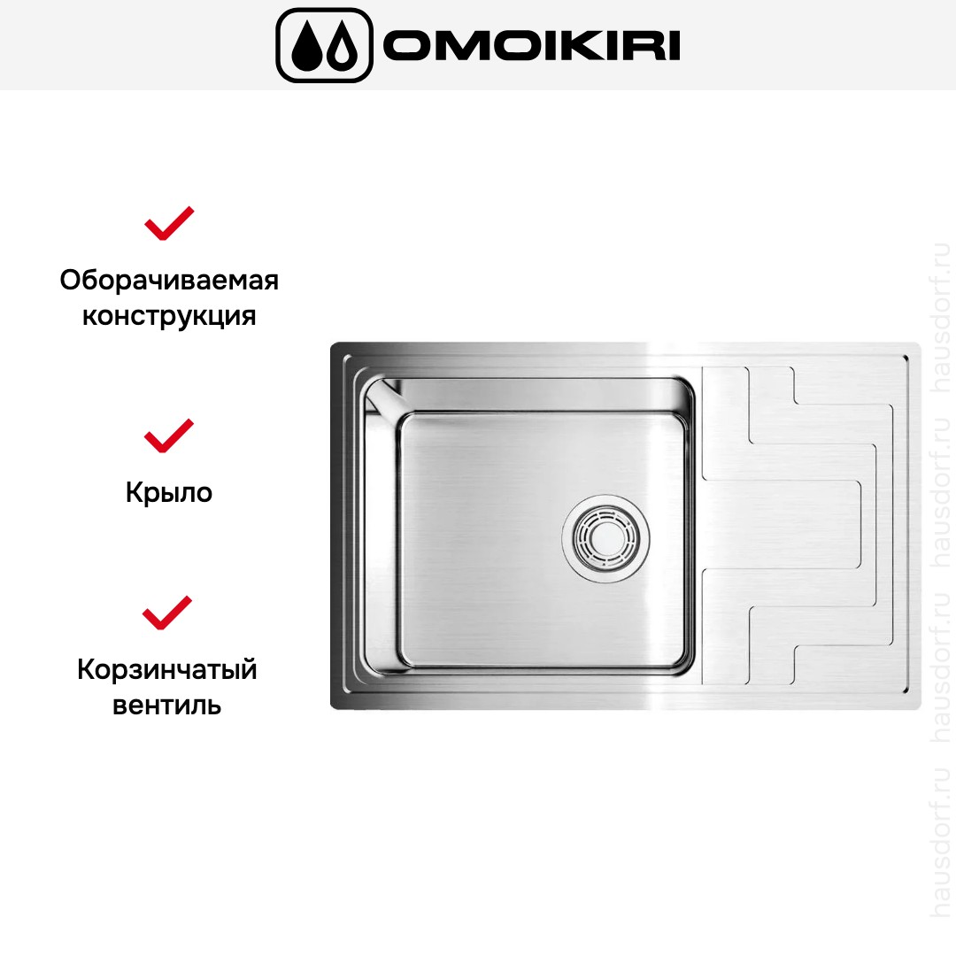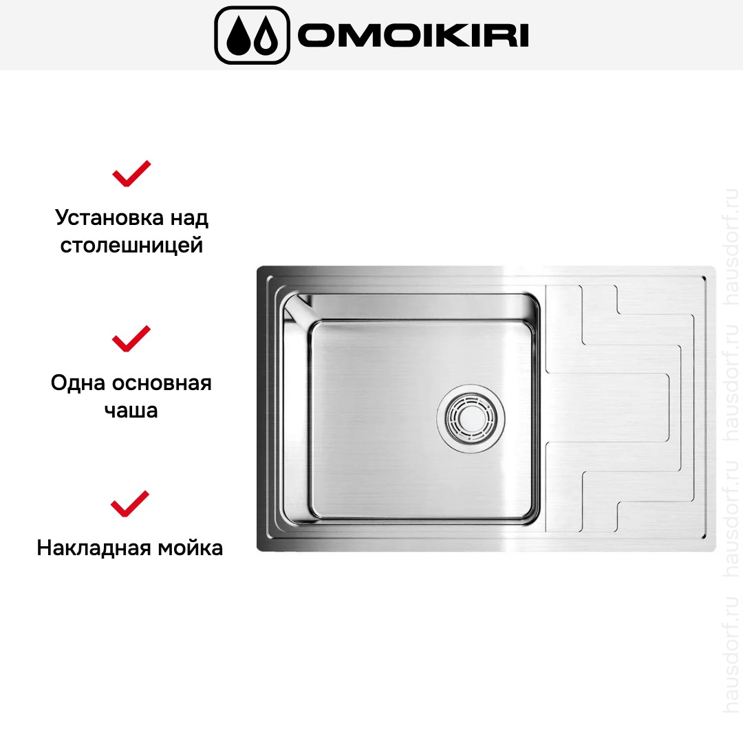 Мойка OMOIKIRI Mizu 78 LB-IN — накладная прямоугольная модель с элегантной отделкой из нержавеющей стали, разработанная для практичных кухонь. Она имеет габариты 78×48 см, что делает её удобной для стандартных столешниц и компактных просторных решений. Дизайн сочетается с минималистичной функциональностью и выдержанным внешним видом из матовой стали.