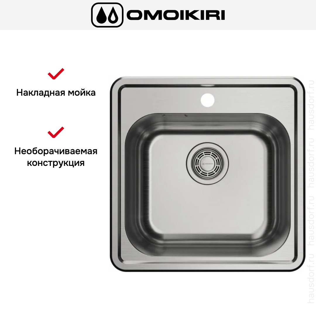 Мойка OMOIKIRI Notoro 48-IN — накладное решение в квадратном корпусе из нержавеющей стали, совмещающее лаконичный внешний вид и практичность для современной кухни.