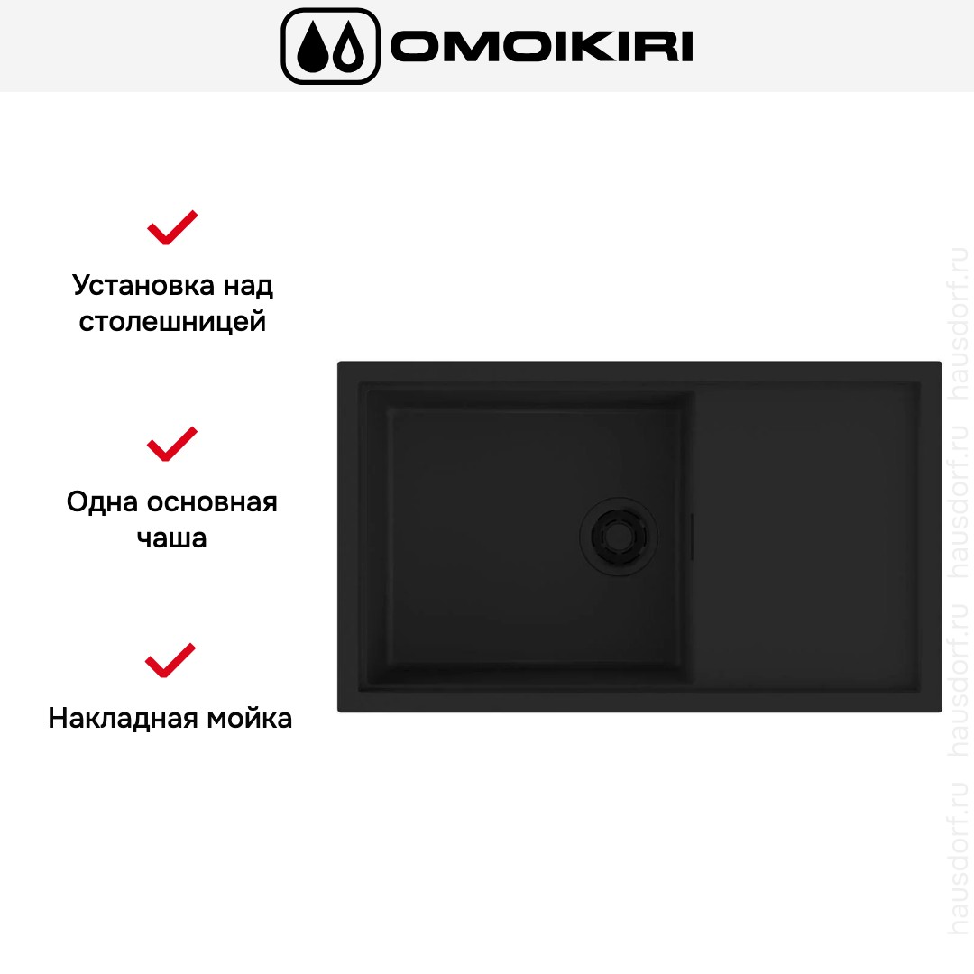 Накладная мойка Omoikiri — отличный выбор для тех, кто хочет создать гармоничное пространство с удобной сантехникой. простой в установке. Преимущество такой конструкции: легко подобрать практически к любой кухне и не придется демонтировать вместе с тумбой при ремонте или перестановке остальной мебели. Данная модель имеет стандартную форму, поэтому подходит большинству пользователей. Устанавливается над столешницей: это самый простой способ монтажа, зачастую с ним можно справиться даже без специалистов, главное — правильно рассчитать размеры ниши.