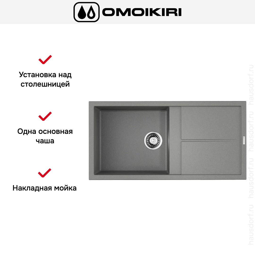 Мойка Omoikiri Sumi 100 GR — накладная прямоугольная модель размером 100×50 см в цвете Серый Ленинград, созданная для комфортной работы у кухонной поверхности. Она устанавливается над столешницей и отличается аккуратными геометрическими пропорциями, которые легко вписываются в современный дизайн интерьера.