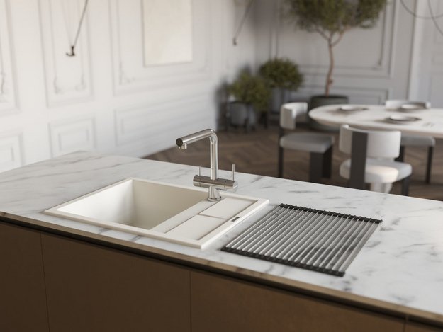 Интегрированная — встраиваемая модель из того же материала, что и столешница. Благодаря этому она выглядит как часть мебели.