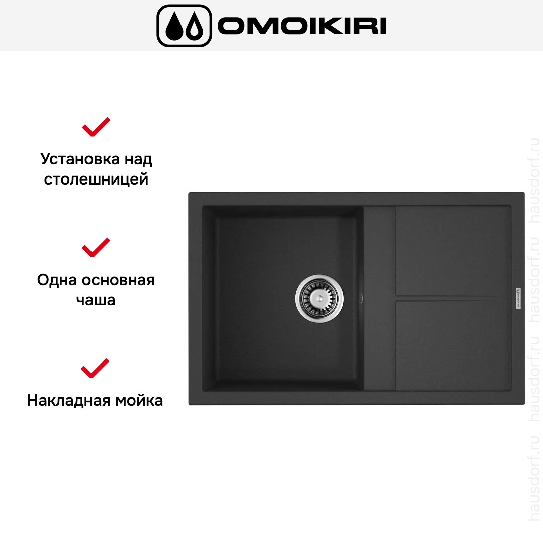 Мойка Omoikiri Sumi 79 BL представляет собой накладную прямоугольную конструкцию размерами 79×50 см с выразительным черным цветом и аккуратным интегрированным крылом.