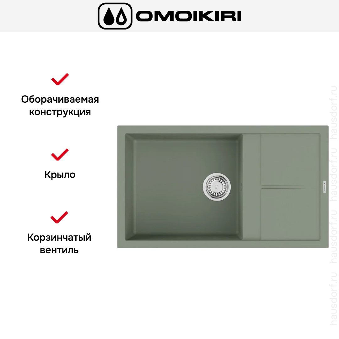 Обратите внимание на дизайнерские отличия мойки Омойкири, которые помогут в создании идеальной кухни в вашем доме. Она выполнена в цвете серо-зеленый. Крыло, расположенное является дополнительным рабочим пространством, на котором можно сушить посуду, разделывать мясо и нарезать овощи.