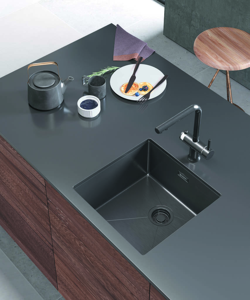 Дизайн сочетает строгие геометрические формы и аккуратные линии с радиусом скругления 1 см, что придает изделию современный вид. Нестандартный графитовый цвет смотрится благородно и практичен в быту. Ручное производство гарантирует внимание к деталям и ровные швы, а PVD-покрытие повышает стойкость поверхности к истиранию и придает устойчивость к воздействию агрессивных моющих средств.
