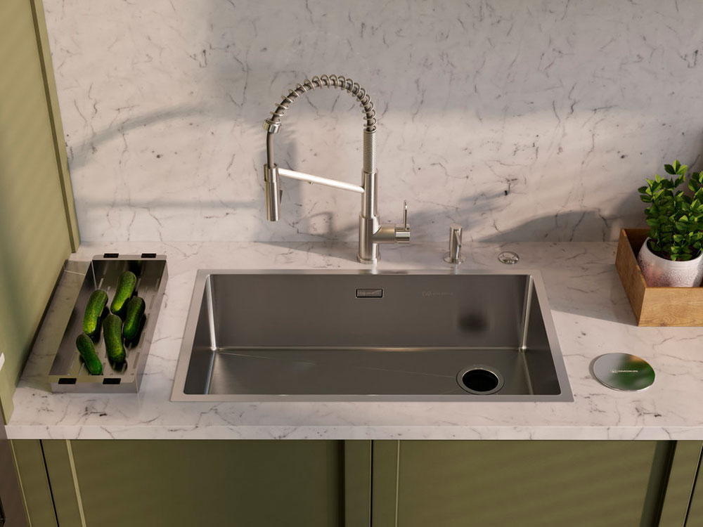 Одна вместительная чаша размером 70×40 см и глубиной 20 см обеспечивает удобство при мытье крупной посуды и приготовлении продуктов. Небольшой радиус скругления 1 см облегчает чистку и сохраняет современный профиль, при этом внутренняя геометрия позволяет компактно размещать контейнеры и сковороды. Встроенный перелив предотвращает случайный перелив воды из чаши, что повышает безопасность эксплуатации и защищает шкафы от влаги.