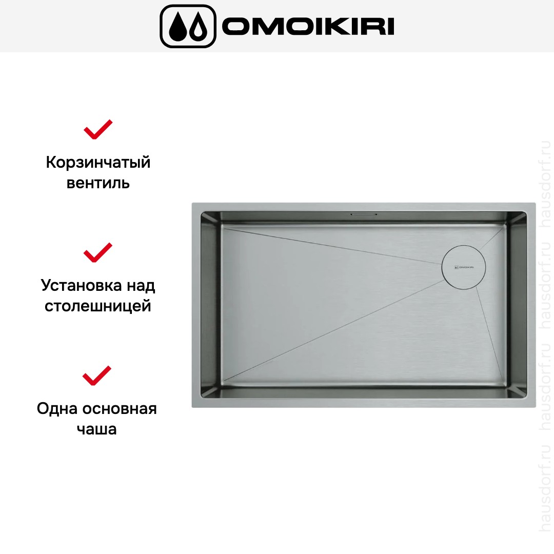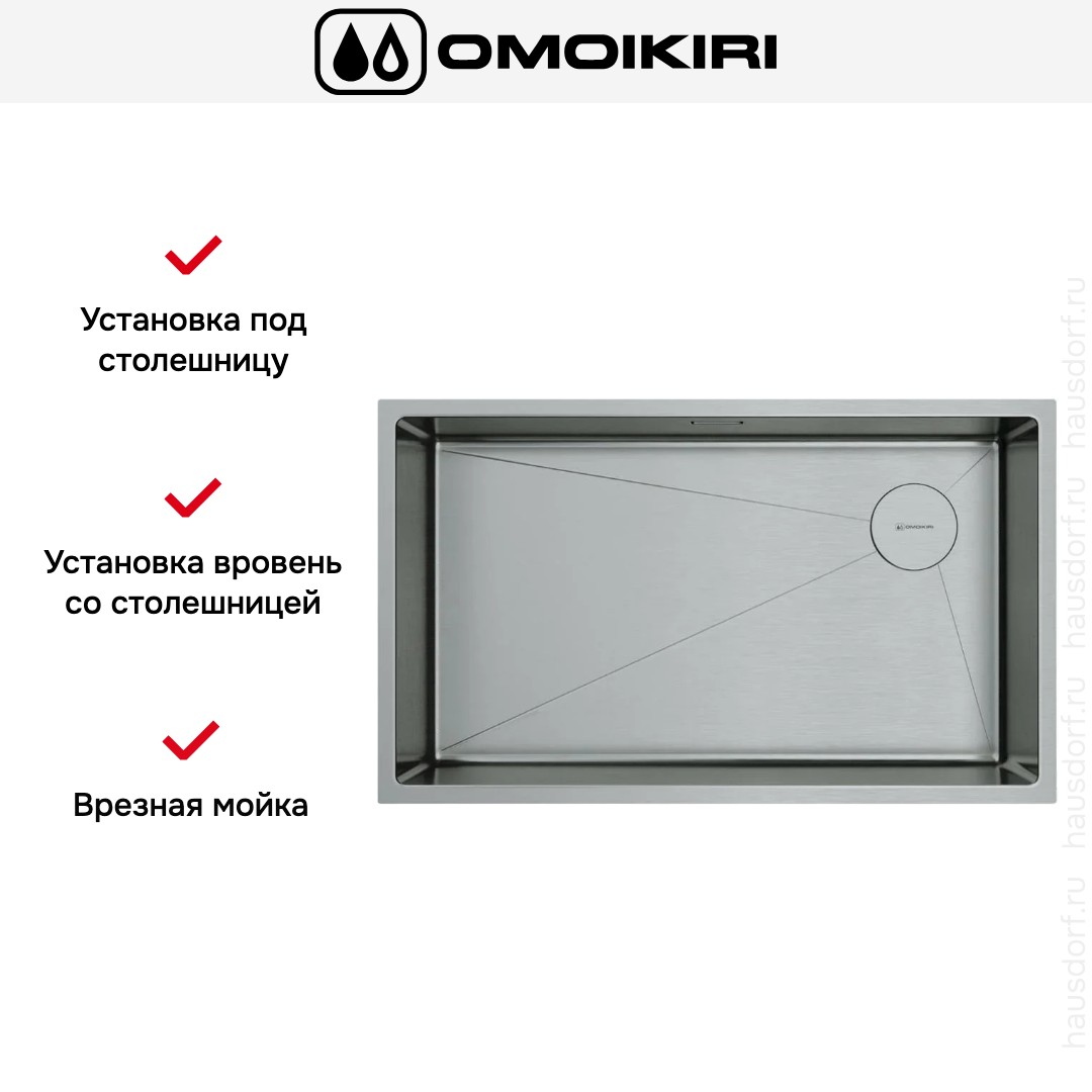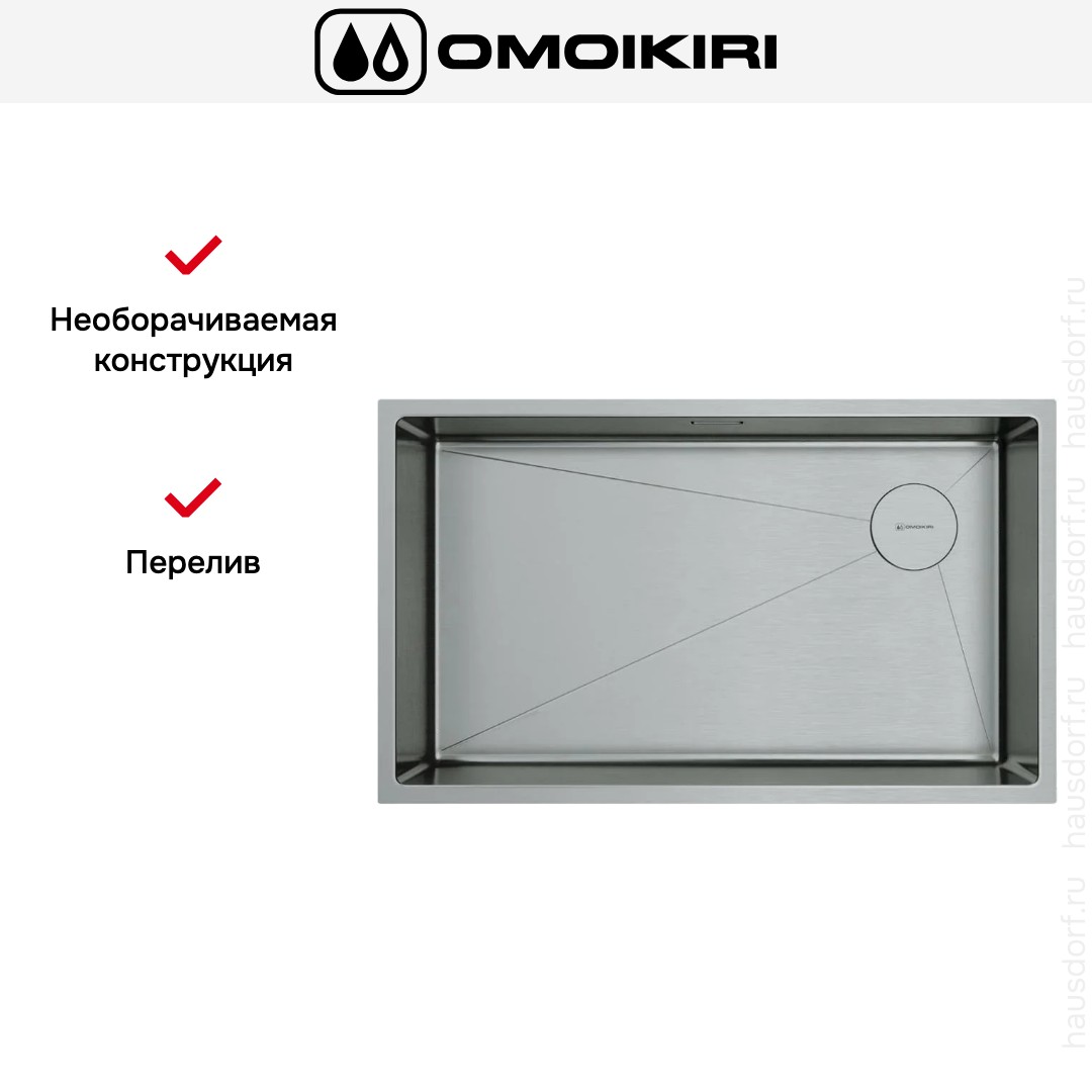 Мойка OMOIKIRI Taki 74 U-IF Side-In — врезная прямоугольная модель из нержавеющей стали с размерами 74×44 см, созданная для компактных и продуманных кухонных пространств.