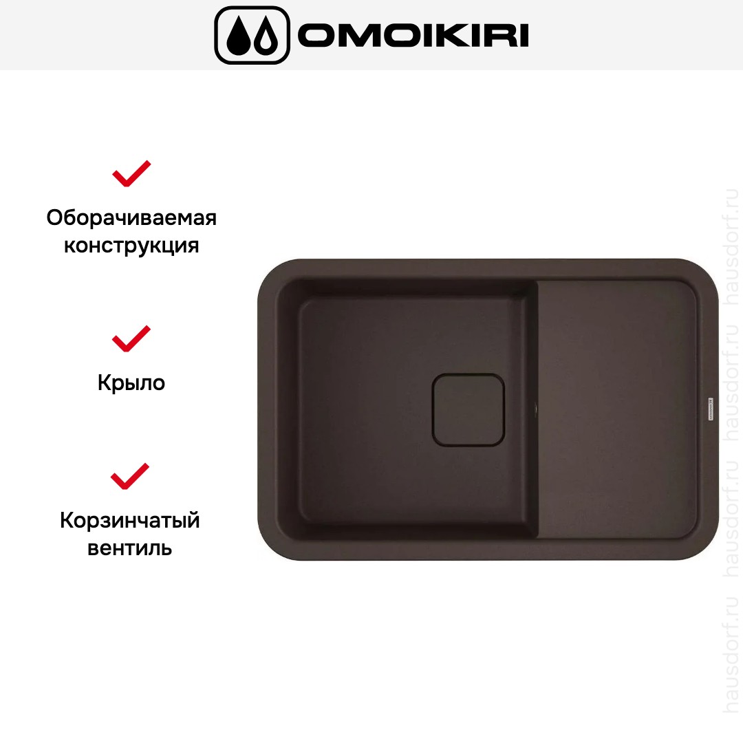 Мойка OMOIKIRI Tasogare 78 DC — накладной прямоугольный вариант с шириной 78 см и глубиной 51 см, оформленный в тоне «тёмный шоколад». Это изделие сочетает сдержанную геометрию и мягкие скругления радиусом 4 см, что делает её лаконичной и в то же время уютной для любой кухни. Толщина стенок 10 мм придаёт приятную солидность внешнему виду и обеспечивает стабильность при монтаже и эксплуатации. Оборачиваемая конструкция даёт свободу выбора стороны для крыла, поэтому её просто вписать в планировку без дополнительных переделок.