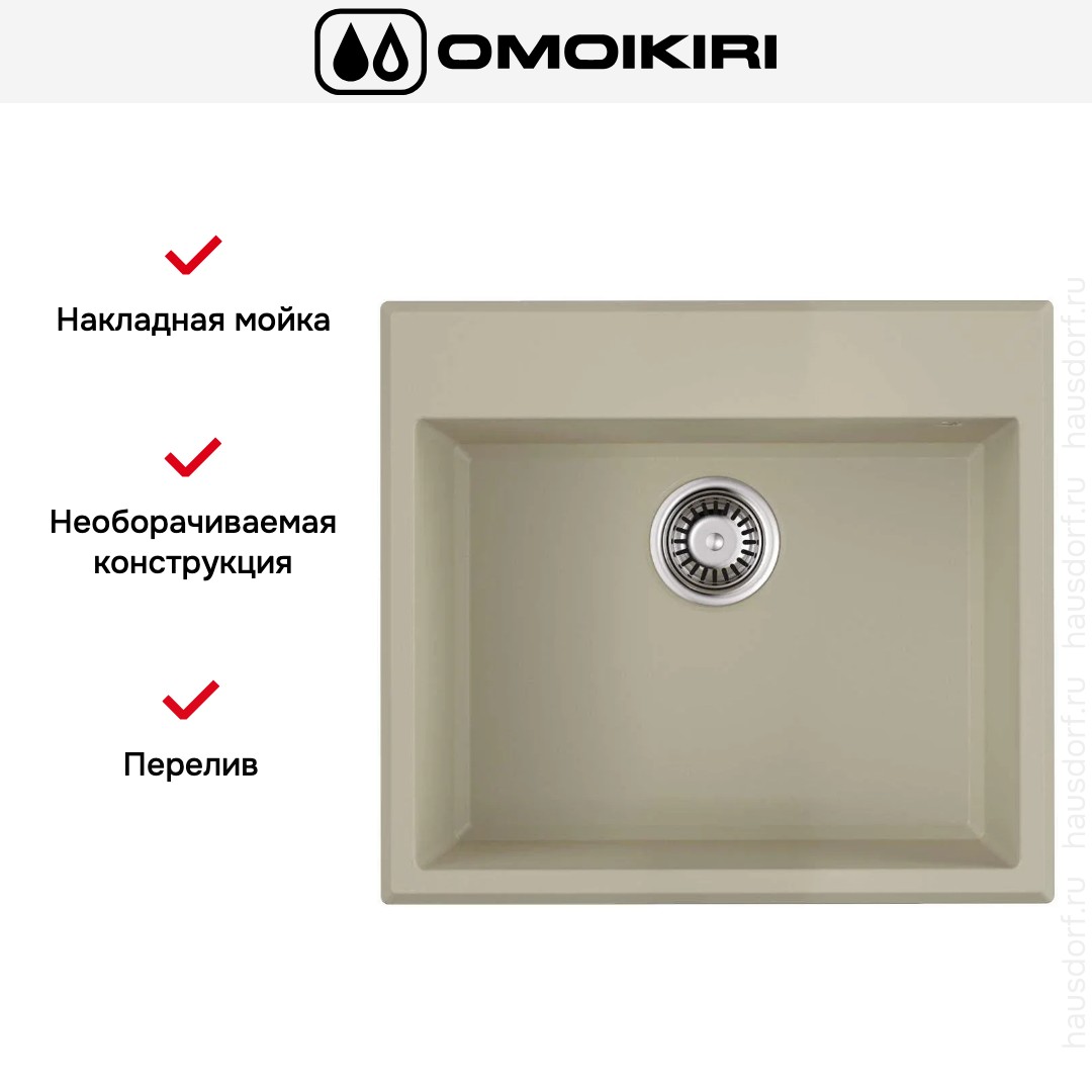 Мойка Omoikiri Tedori 57 BE обладает строгим прямоугольным силуетом и лаконичным ванильным оттенком, который легко впишется в большинство кухонных интерьеров. Ее компактные габариты 57×51 см делают изделие отличным выбором для небольших пространств и стандартных модулей. Дизайн оформлен под накладную установку, что упрощает замену старой раковины и минимизирует вмешательство в столешницу.