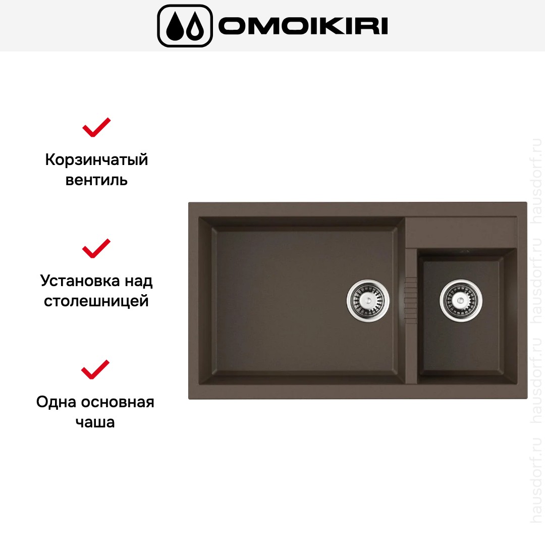 Мойка Omoikiri Tedori 86-2-LB-ES — накладная прямоугольная модель шириной 86 см в цвете «Эспрессо», выполненная из прочного композита TetoGranit. Ее строгий геометричный силуэт легко впишется в современную кухню и подчеркнёт тёплую деревянную или тёмную матовую столешницу. Тёмный оттенок придаёт интерьеру глубину и скрывает незначительные следы эксплуатации, сохраняя аккуратный вид надолго.